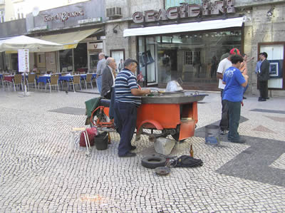 The hot chestnut man - note the oven built on a moped; complete with a flat